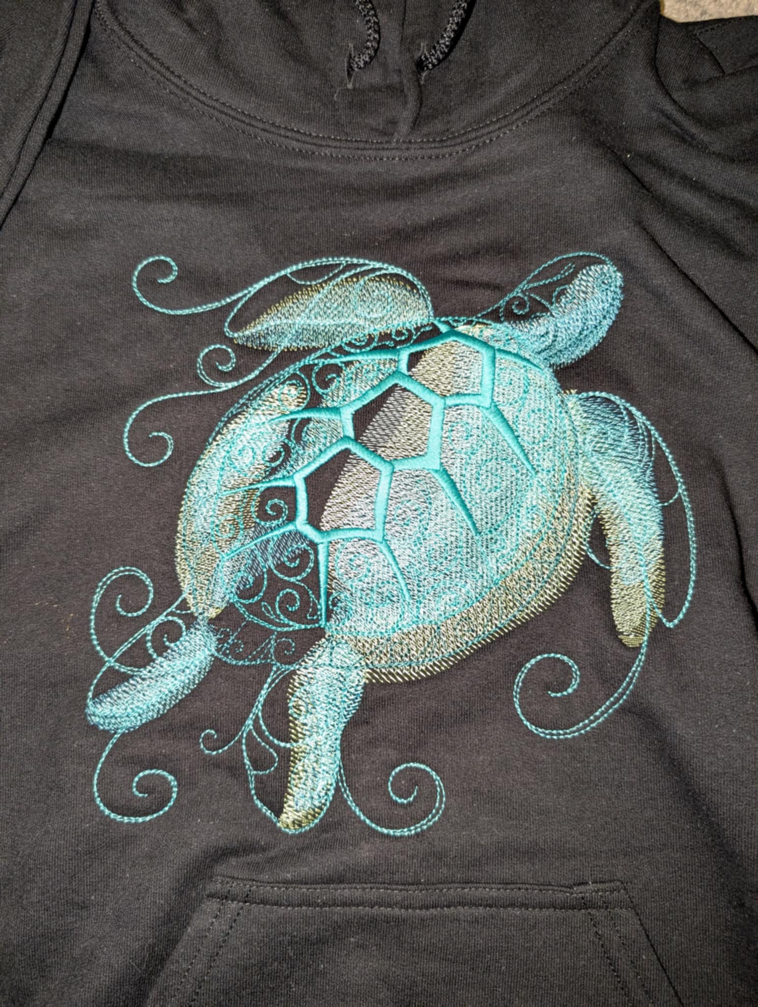 π§΅ Detailed embroidery β A swirling sea turtle design brought to life in rich ocean tones