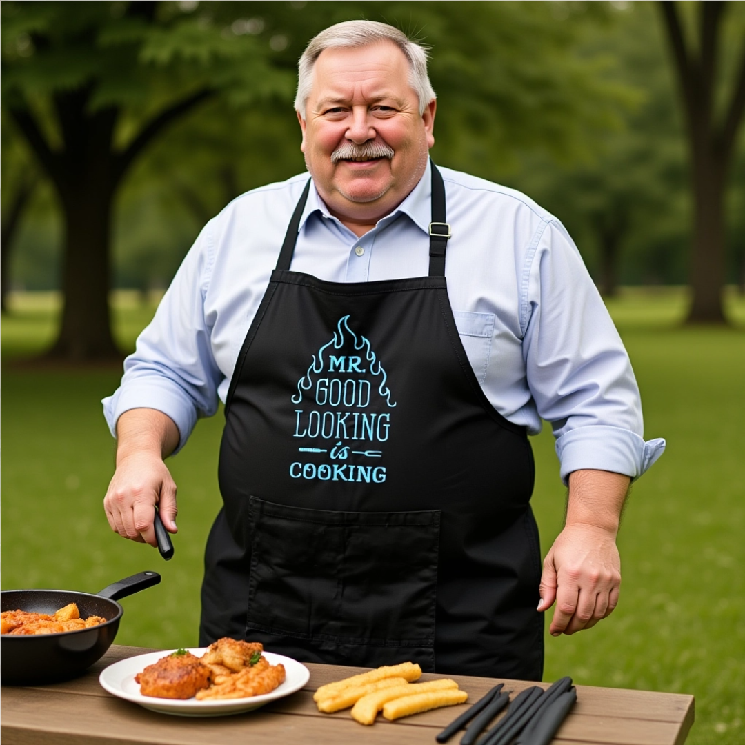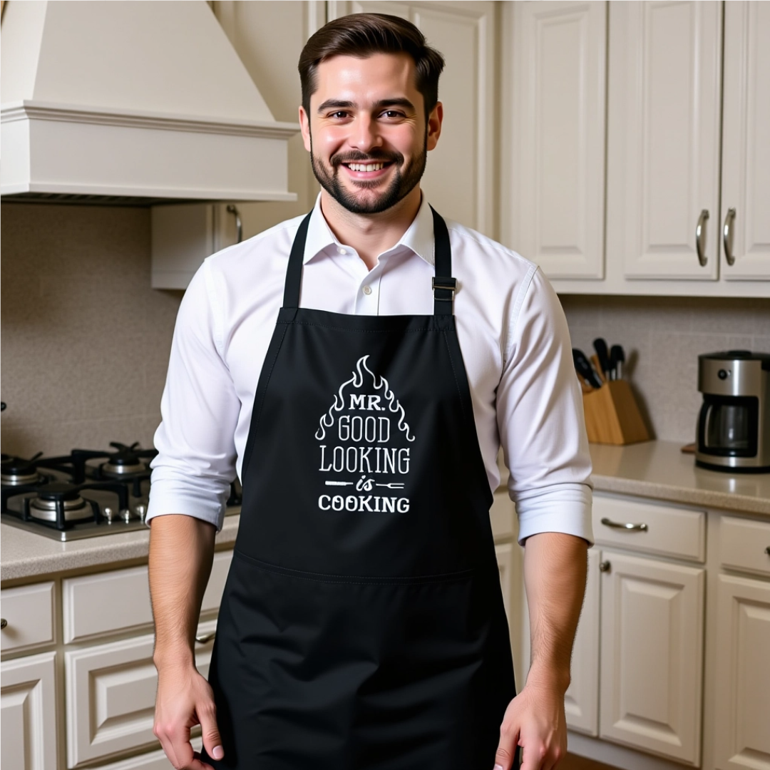 Turn up the heat with this cheeky custom BBQ apron! Our “Mr. Good Looking Is Cooking” apron is the ultimate kitchen or grill-side statement — perfect for dads, husbands, grandads, or the self-proclaimed BBQ king of the household.
