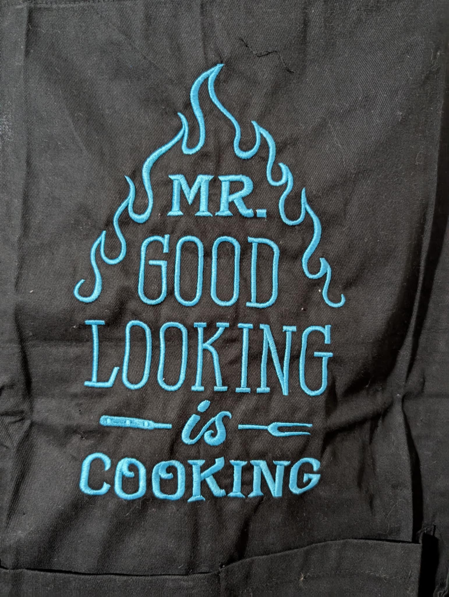 Design reads: “Mr. Good Looking Is Cooking” with a flame graphic