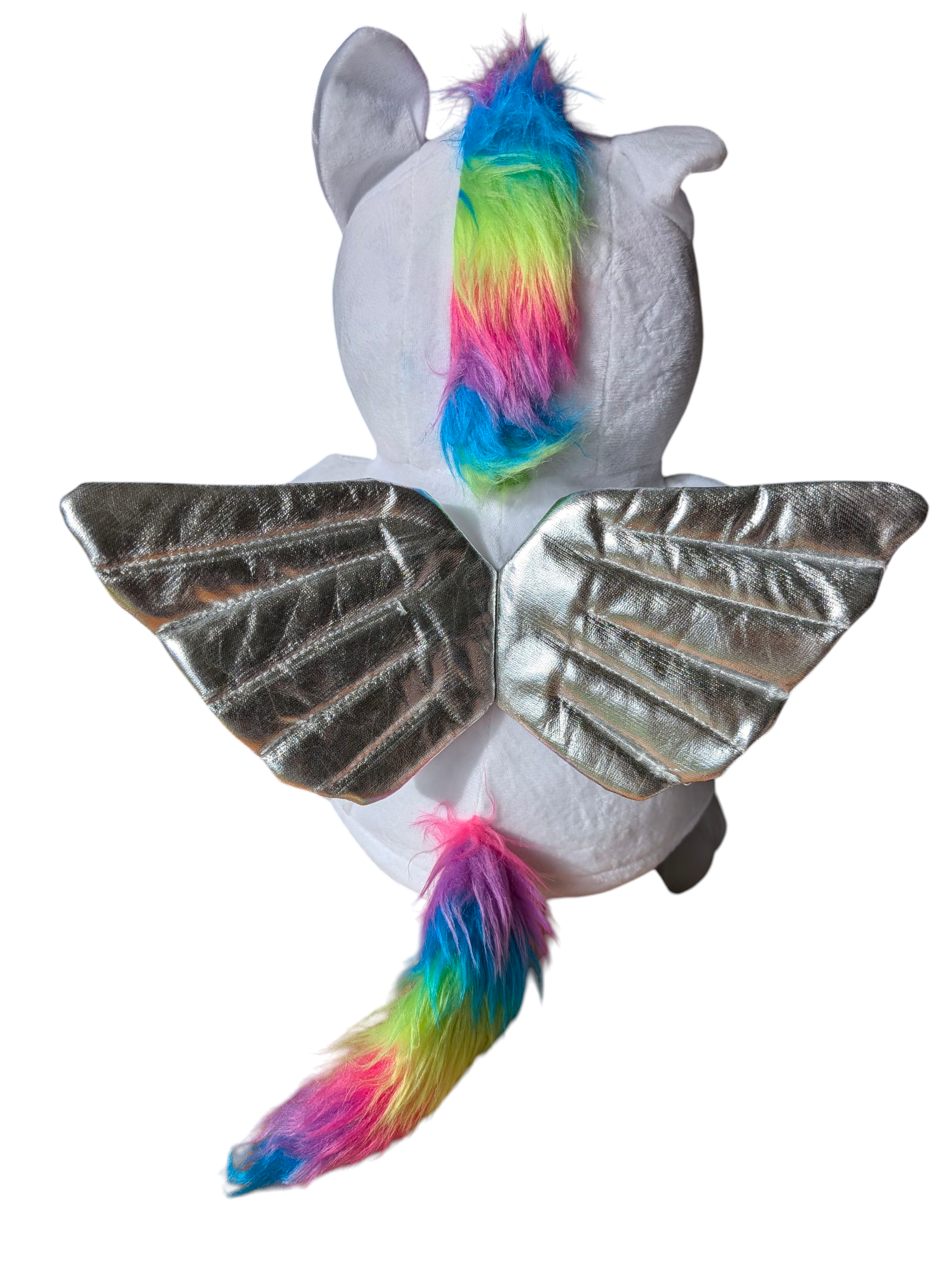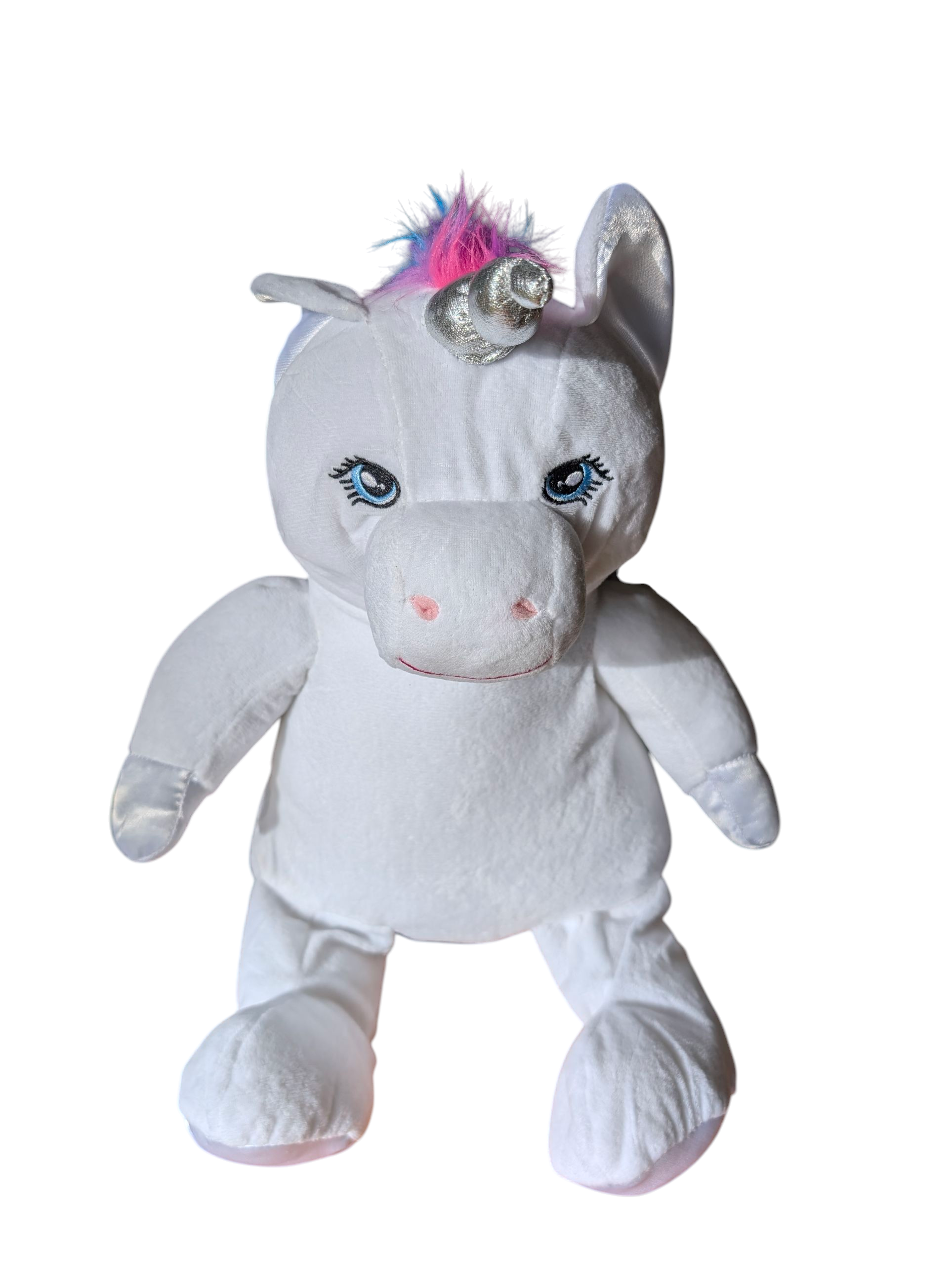 Add a little magic to someone’s world with our custom embroidered unicorn plush – soft, sparkly, and full of personality! This white unicorn features a rainbow mane and tail, shimmery silver wings, and a whole lot of charm.