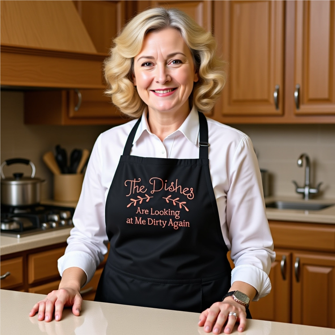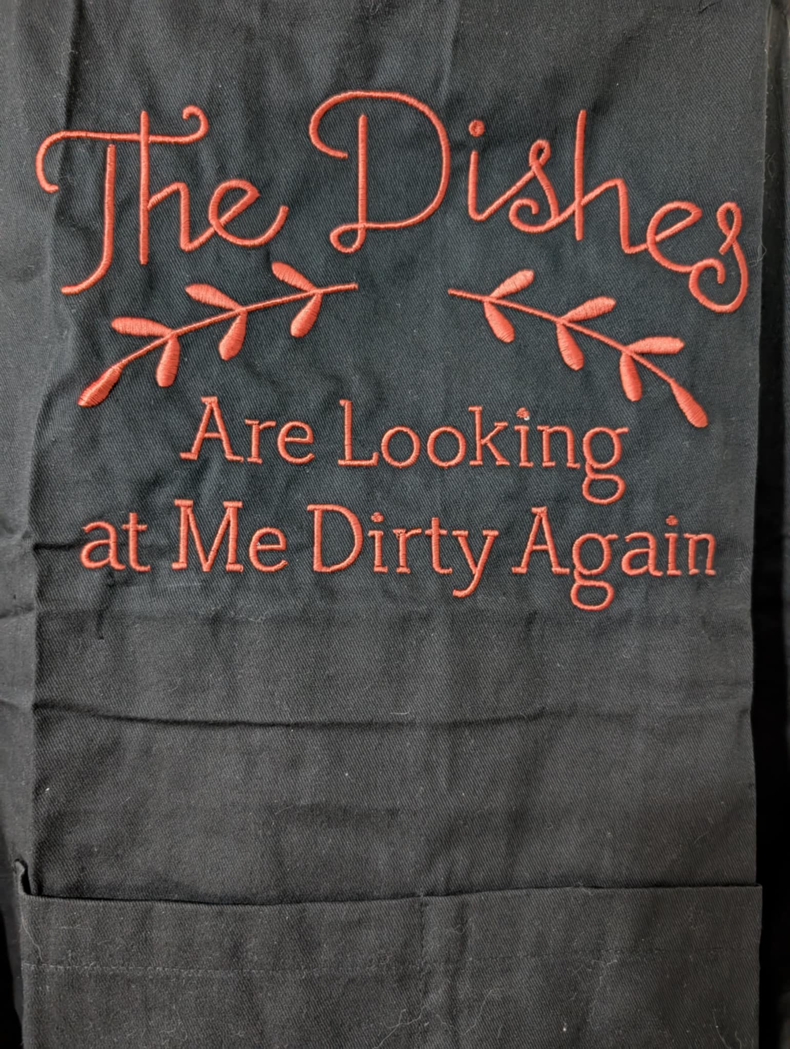“The Dishes Are Looking at Me Dirty Again”, this apron is the perfect match for anyone who’s tired of seeing those side-eyeing plates.